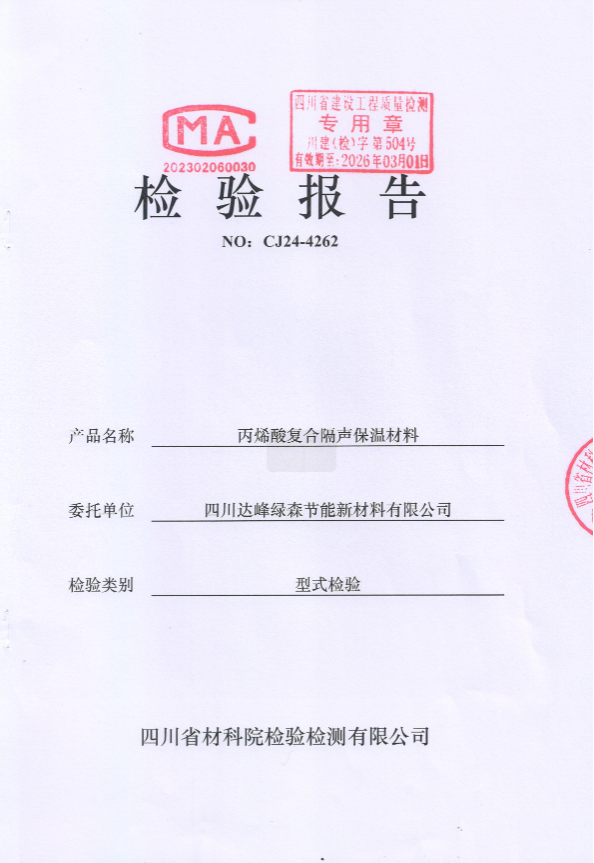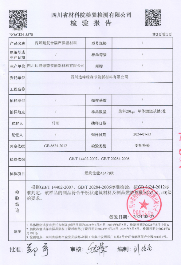 丙烯酸复合隔声保温材料的燃烧性能达到A2级(GB 8624-2012标准),满足建筑防火规范要求,为建筑提供了更高的安全保障。