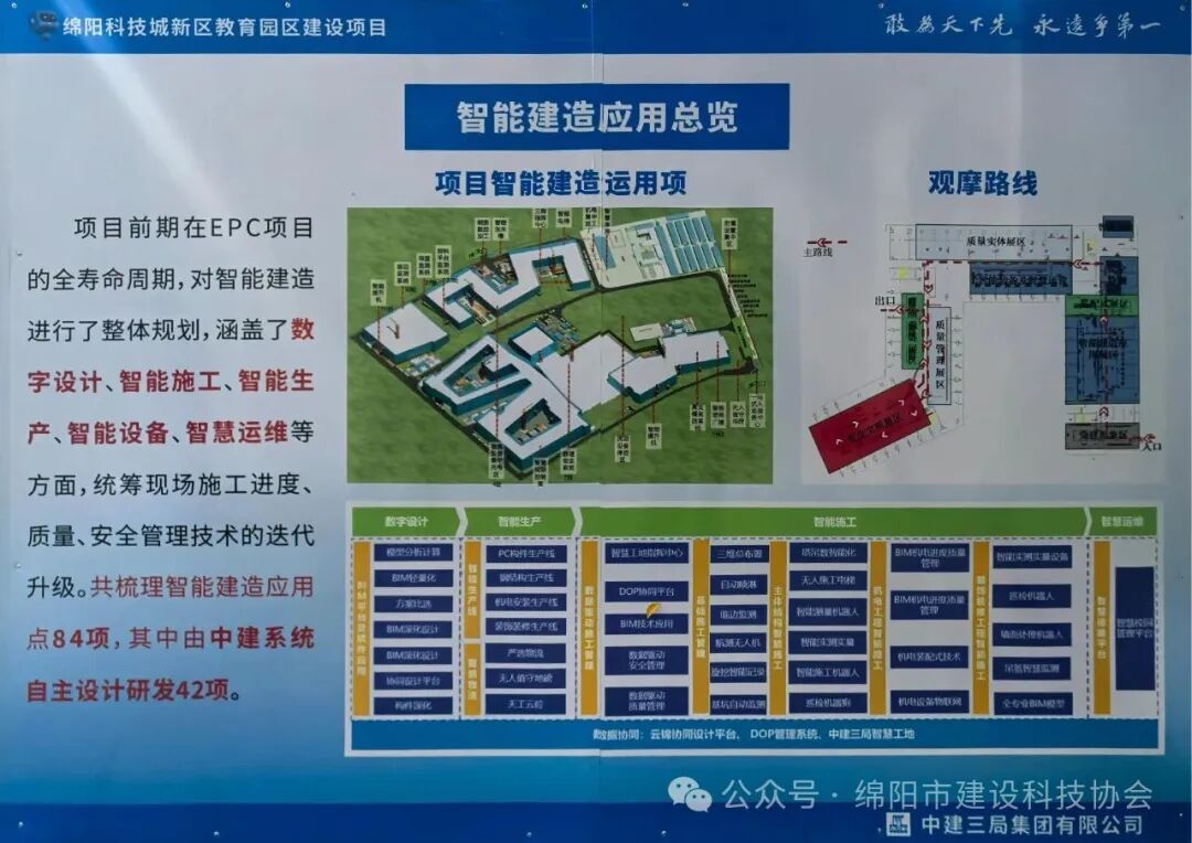在活动筹备过程中,协会全程参与指导工作。自8月底起,重点指导中建三局绵阳中学项目部系统梳理了84项智能建造应用点,并按数字设计、智能生产、智能施工、智慧运维的逻辑顺序进行展示。