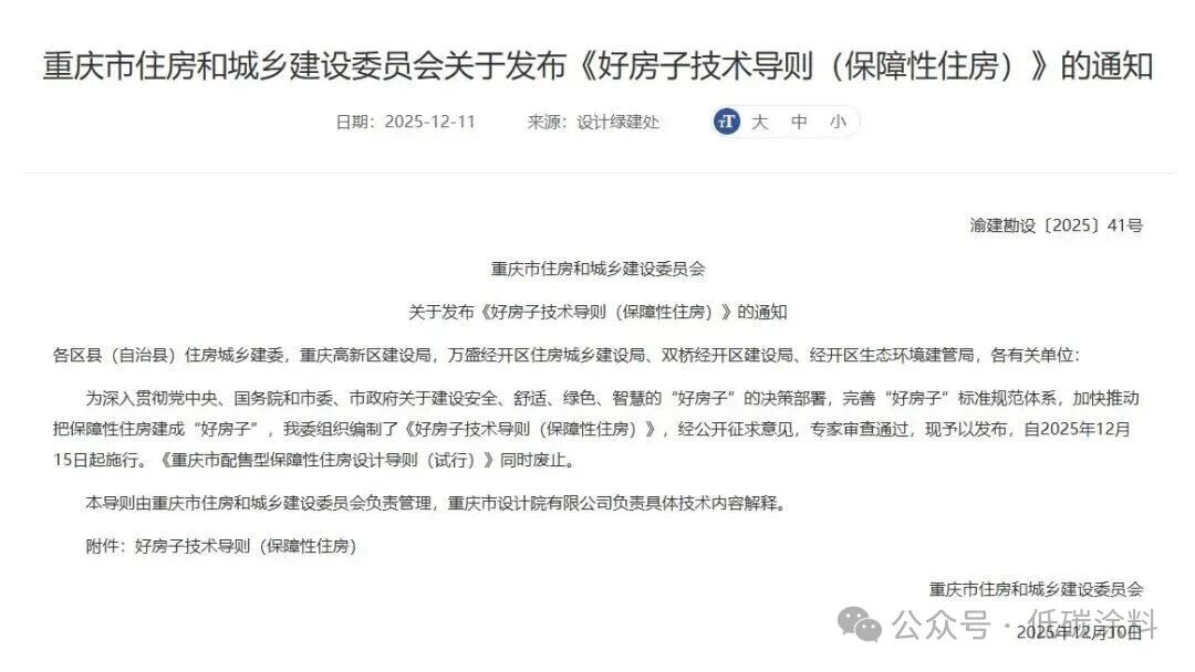 《导则》的发布实施,进一步完善了重庆“好房子”标准规范体系,将推动保障性住房从“有房住”向“住好房”转变。通过标准化、品质化建设,让住房困难家庭、工薪收入家庭及引进人才等群体住上更安心、舒心、省心的“好房子”,既彰显了政府工程的民生担当,也为建设现代化人民城市注入温暖底色。